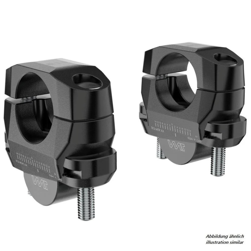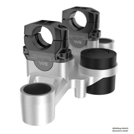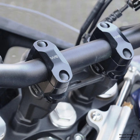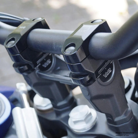 These adjustable handlebar risers are mounted on the original lower handlebar clamps. The adjustable offset allows the handlebars to be adjusted closer or further from the body in 2 mm increments (+/- 14 mm). The higher handlebar position results in a more relaxed seating position and a more direct riding feel. The offset allows the handlebars to be individually adapted to personal needs and riding characteristics.