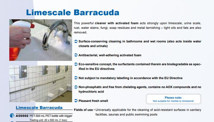 A water-based acidic cleaner designed to remove limescale and urine scale in bathrooms and wet areas.