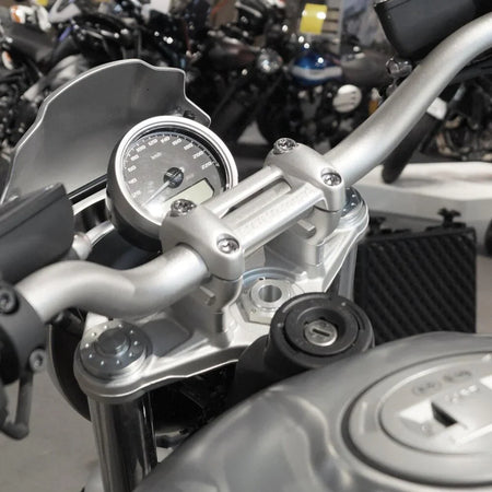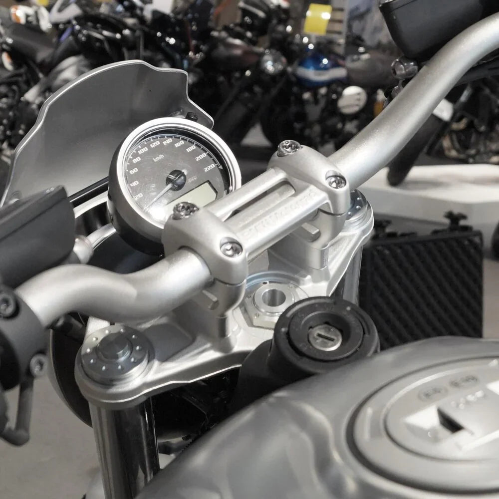These special handlebar risers for your BMW R nineT (fits all R NineT models - except Racer) are mounted between the fork bridge and the original risers (handlebar clamp). The higher handlebar position creates a more relaxed seating position and a more direct driving experience.