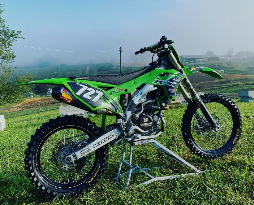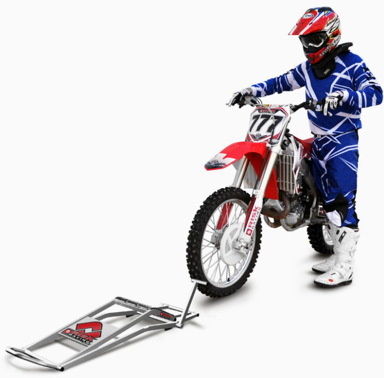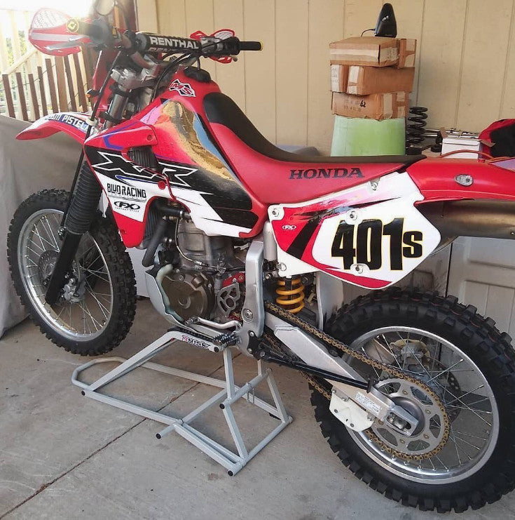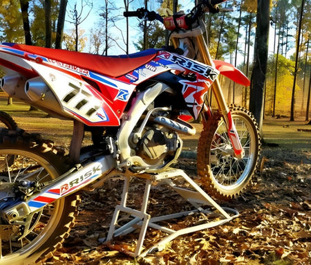 Every brand, year, and model of trail bike has a slightly different frame design, so not all motorcycles sit evenly on traditional trail bike stands. As a result, the front or rear tire often touches the ground when placed on the stand. Aftermarket skid plates can also affect this angle, causing the bike to lean low on one side. The Risk Racing A.T.S. Stand solves this problem.