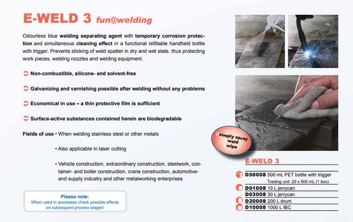 Prevents sticking of weld spatter in dry and wet state, thus protecting work pieces, welding nozzles and welding equipment.